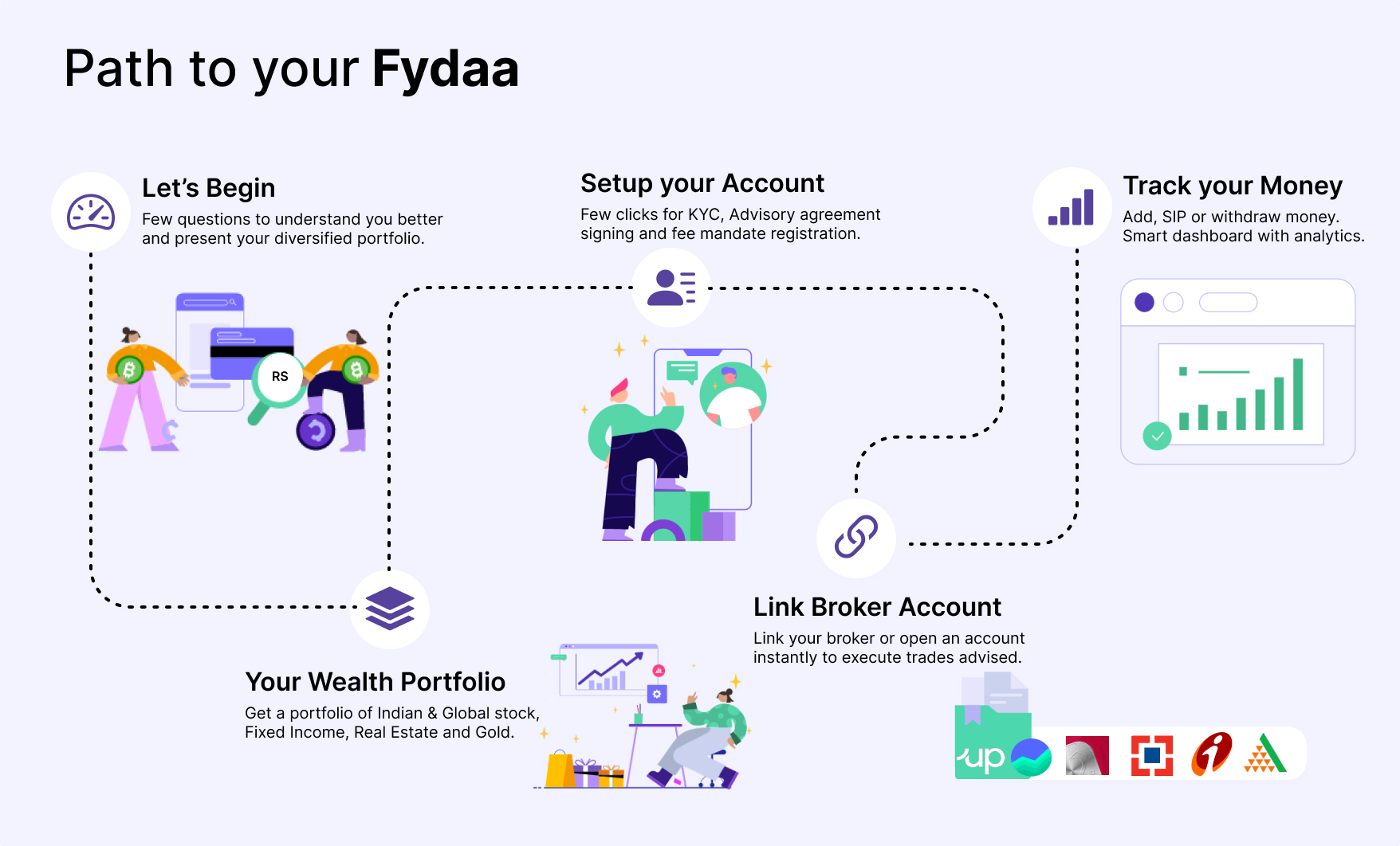 Unlike your broker, fydaa do not execute the trades but advice on which securities to buy/sell on periodic basis based on your risk profile. Your broker charges brokerage on every transaction.